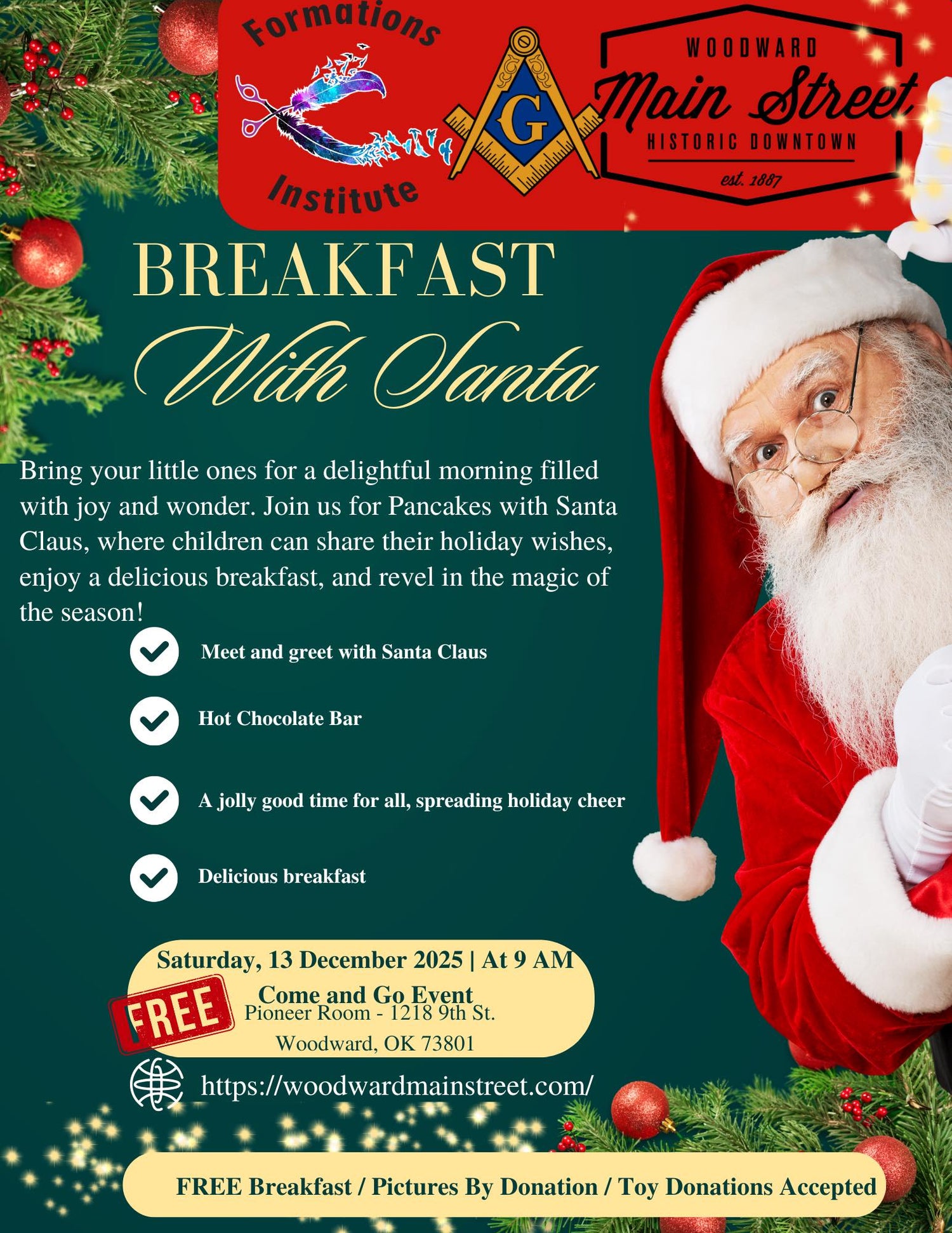 FREE Community Breakfast — Breakfast with Santa! Bring the kiddos and your holiday cheer for a cozy, come-and-go morning of pancakes, a hot chocolate bar, photos with Santa (by donation), and joyful community time together. Pioneer Room, 1218 9th St., Woodward, OK Saturday, Dec 13, 2025 • 9:00 AM FREE breakfast for the community • Toy donations accepted